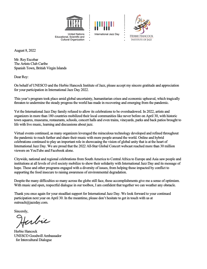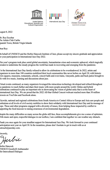 As Partner of International Jazz Day Org /Herbie Hancock Jazz Institute, Rey Escobar brought to British Virgin Islands this international celebration for the first time ever. His roll as producer, music director and coordinator, was crucial to involve some of the most talented musicians of the territory. During the event, Jazz Harmony and improvisación workshops were given to ESHS music students, with concerts at Rosewwod Little Dix Bay (Virgin Gorda) and Eileene Parsons Auditorium (Tortola).
